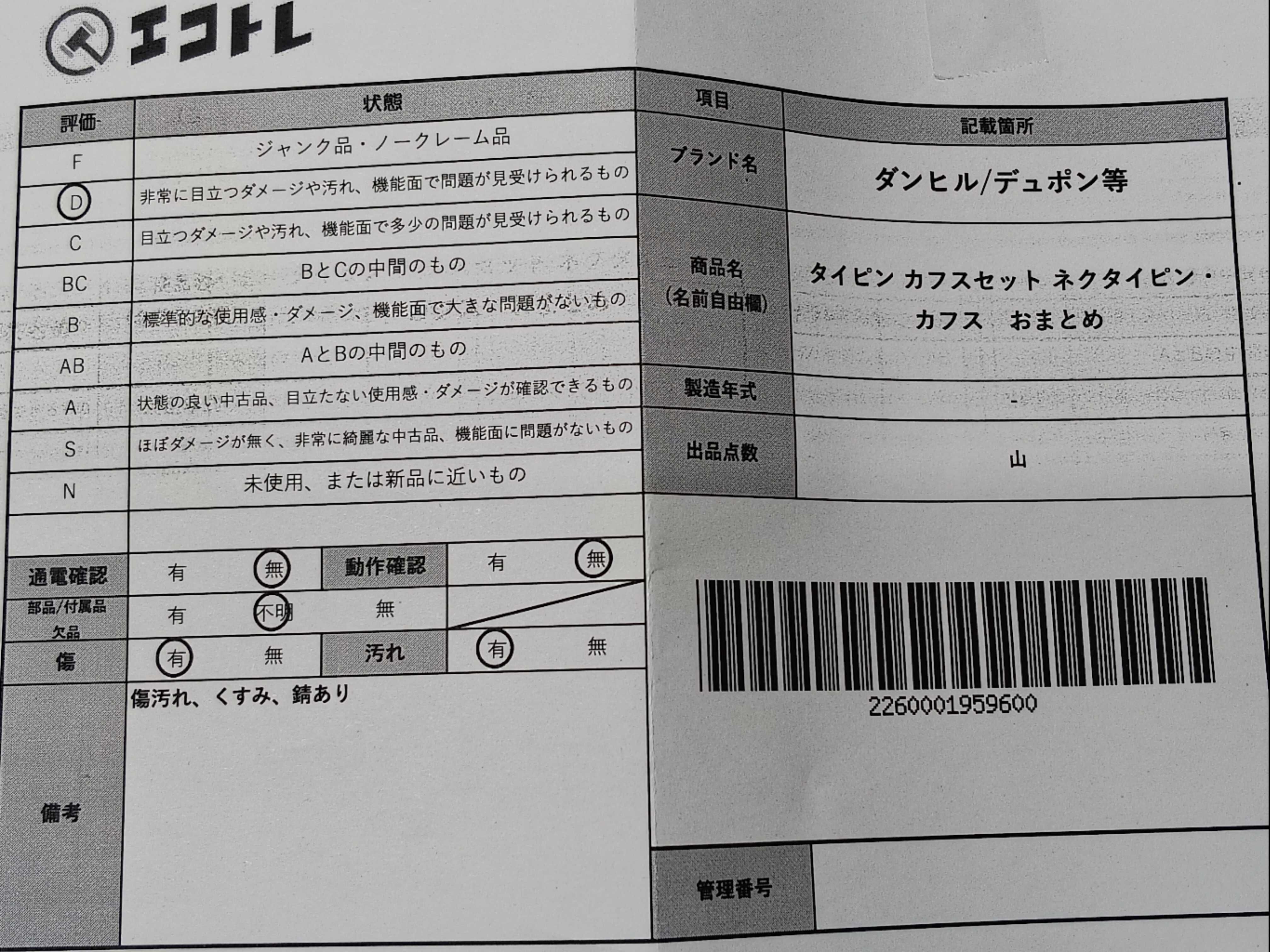 商品内容によって、JITBOXなどでの発送となる可能性がございます事ご理解下さい。年式などの商品情報詳細は写真にてご確認願います。※ご入札の際はご利用規約をよくお読みになってからのご参加お願いします。","タイプライン": "", "カテゴリ": "小物", "形状コード": "ネクタイピン・カフス", "付属品コード": "", "シリアル・シール・型番": ""