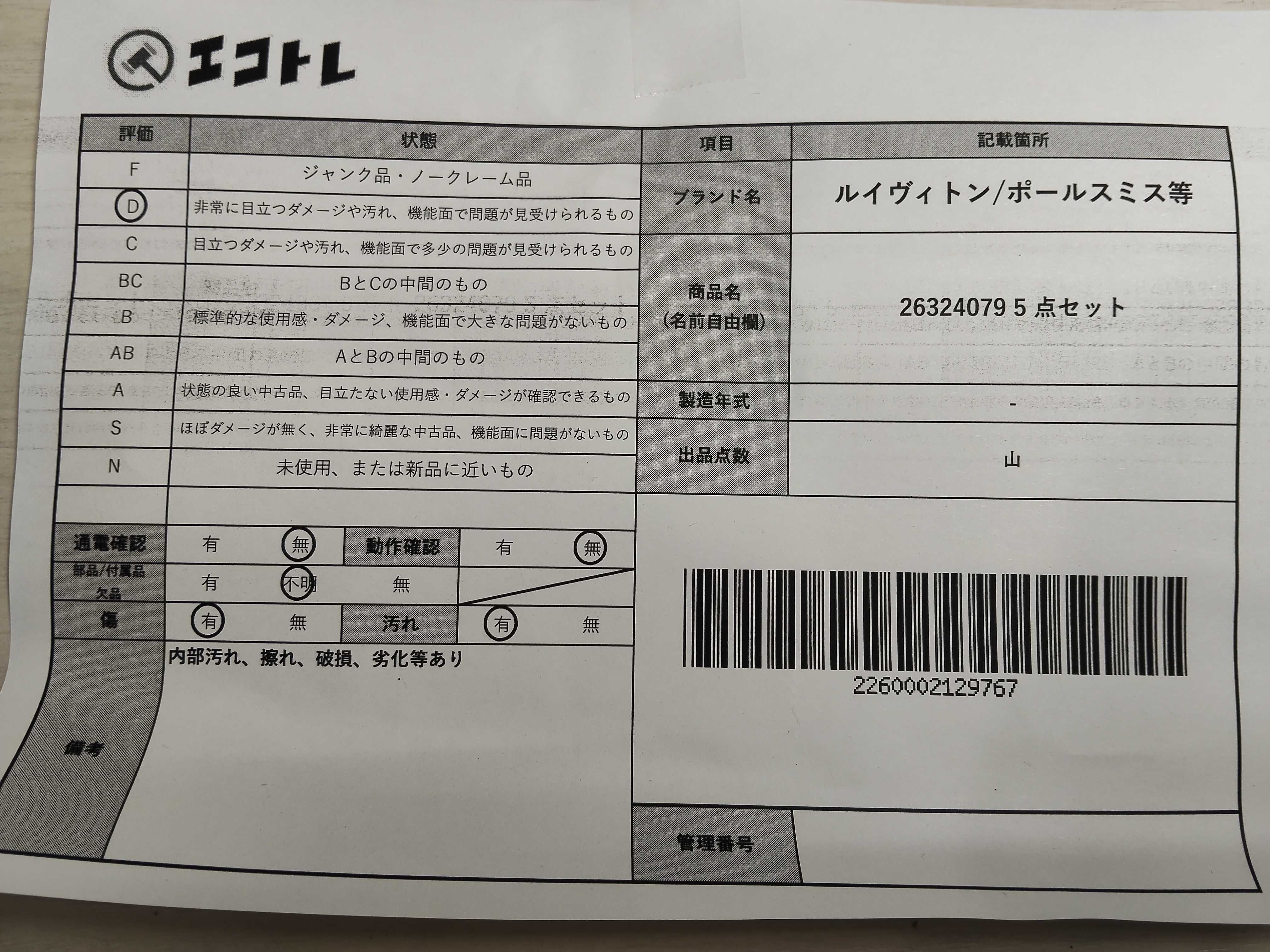 商品内容によって、JITBOXなどでの発送となる可能性がございます事ご理解下さい。年式などの商品情報詳細は写真にてご確認願います。※ご入札の際はご利用規約をよくお読みになってからのご参加お願いします。","タイプライン": "", "カテゴリ": "小物", "形状コード": "財布", "付属品コード": "", "シリアル・シール・型番": ""
