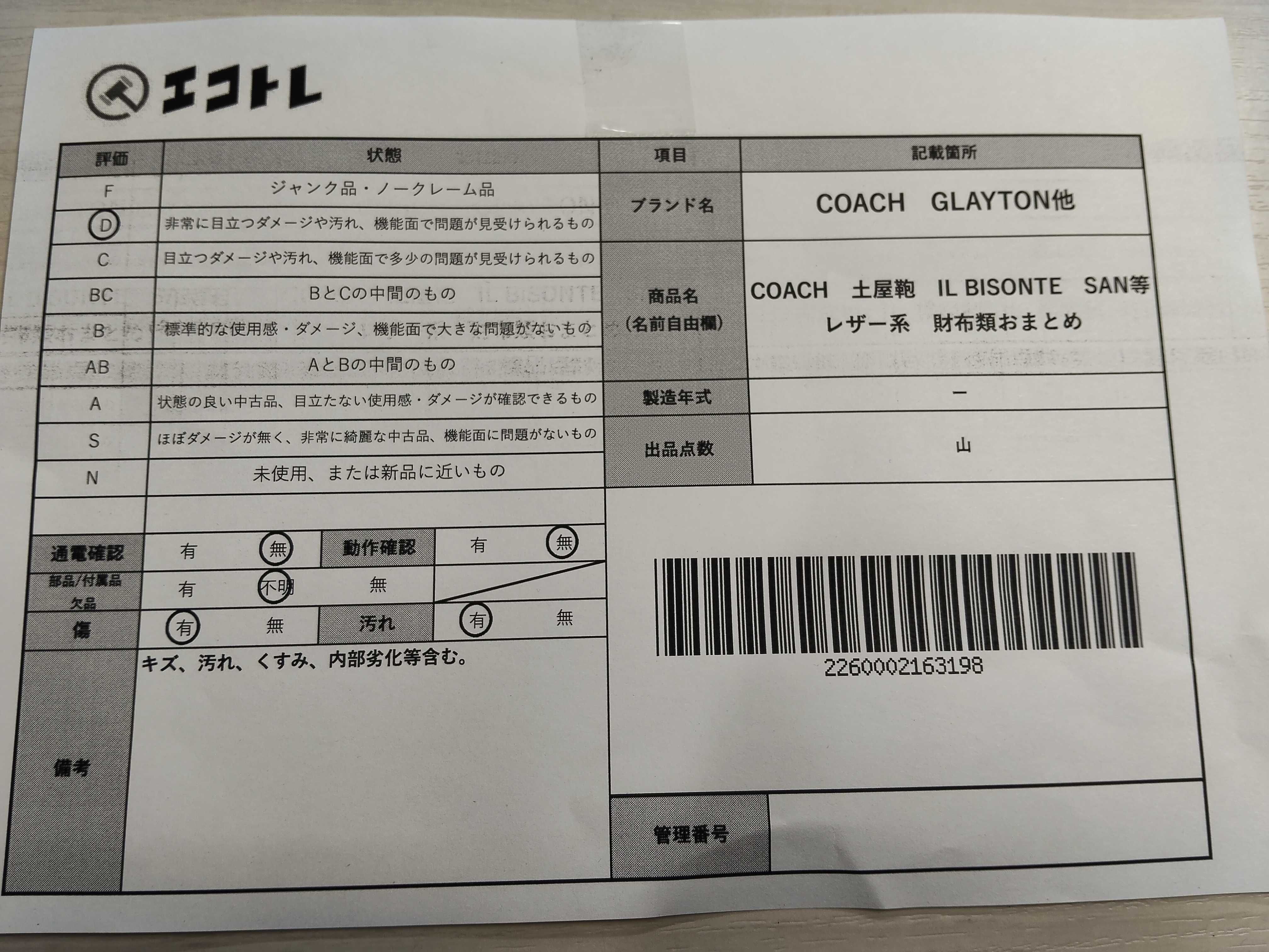 商品内容によって、JITBOXなどでの発送となる可能性がございます事ご理解下さい。年式などの商品情報詳細は写真にてご確認願います。※ご入札の際はご利用規約をよくお読みになってからのご参加お願いします。","タイプライン": "", "カテゴリ": "小物", "形状コード": "財布", "付属品コード": "", "シリアル・シール・型番": ""
