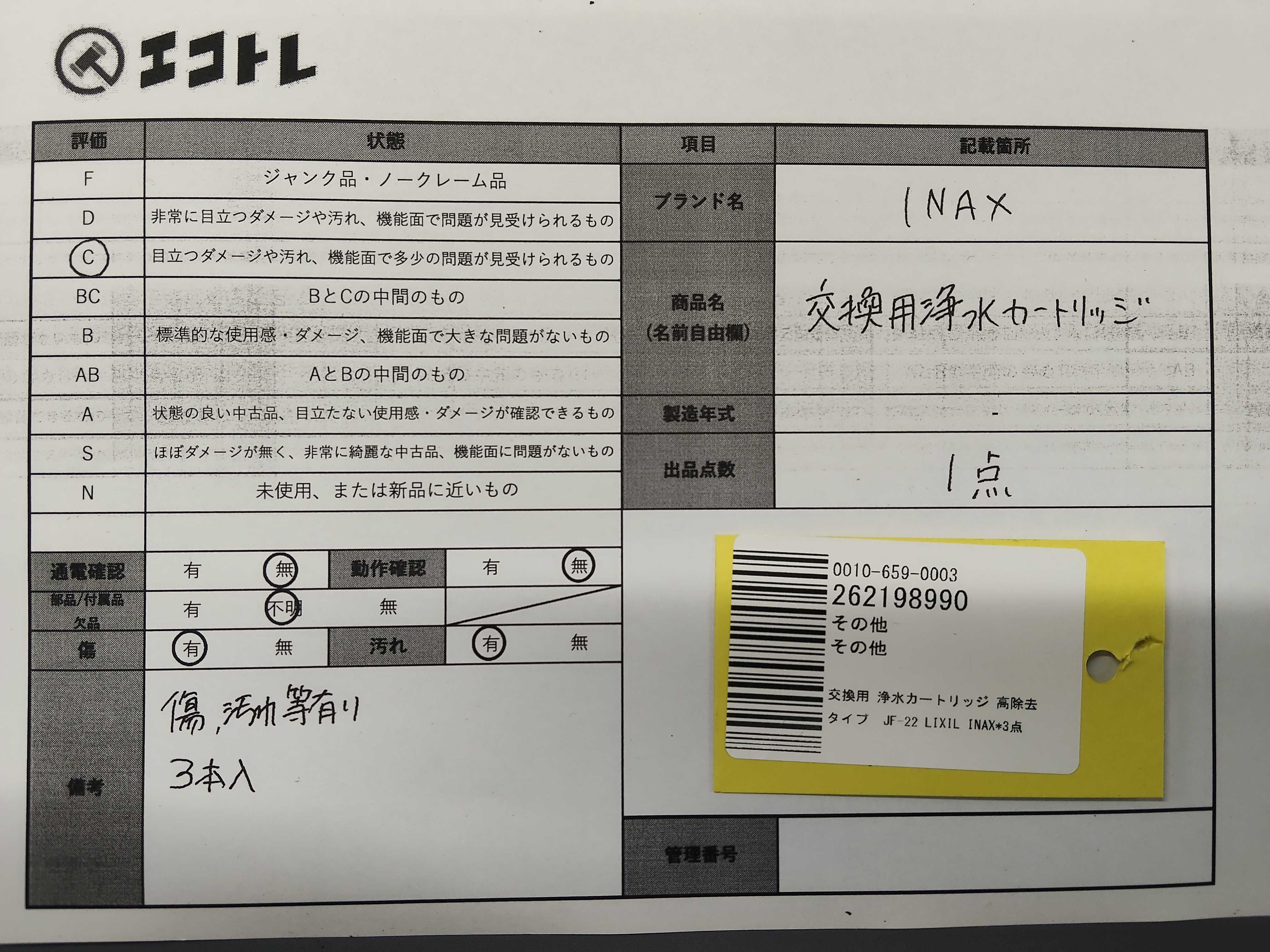 (11948_0458)▼交換用 浄水カートリッジ 高除去タイプ JF-22 LIXIL INAX*3点 その他小物