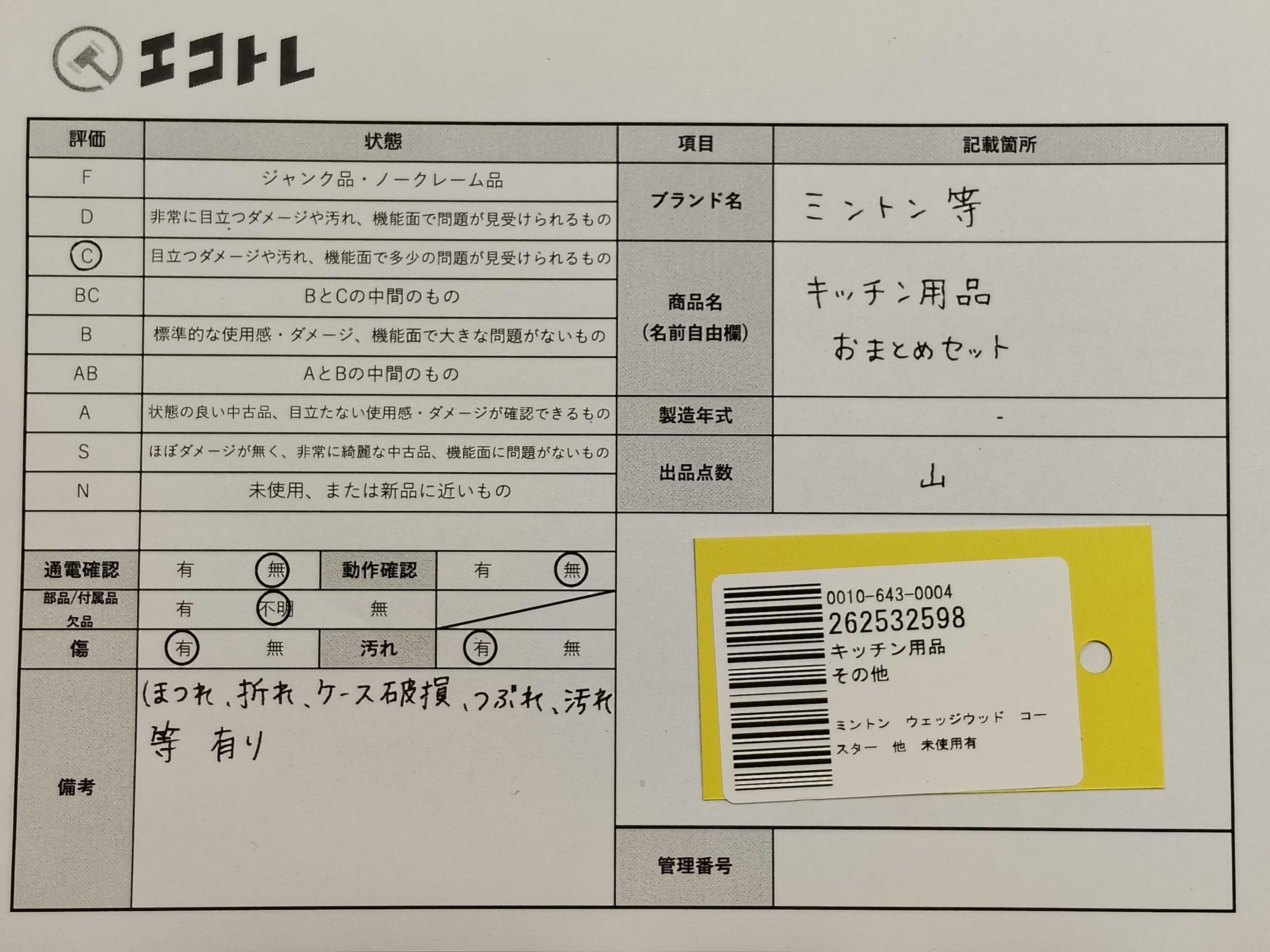 商品内容によって、JITBOXなどでの発送となる可能性がございます事ご理解下さい。年式などの商品情報詳細は写真にてご確認願います。※ご入札の際はご利用規約をよくお読みになってからのご参加お願いします。","タイプライン": "", "カテゴリ": "小物", "形状コード": "その他小物", "付属品コード": "", "シリアル・シール・型番": ""