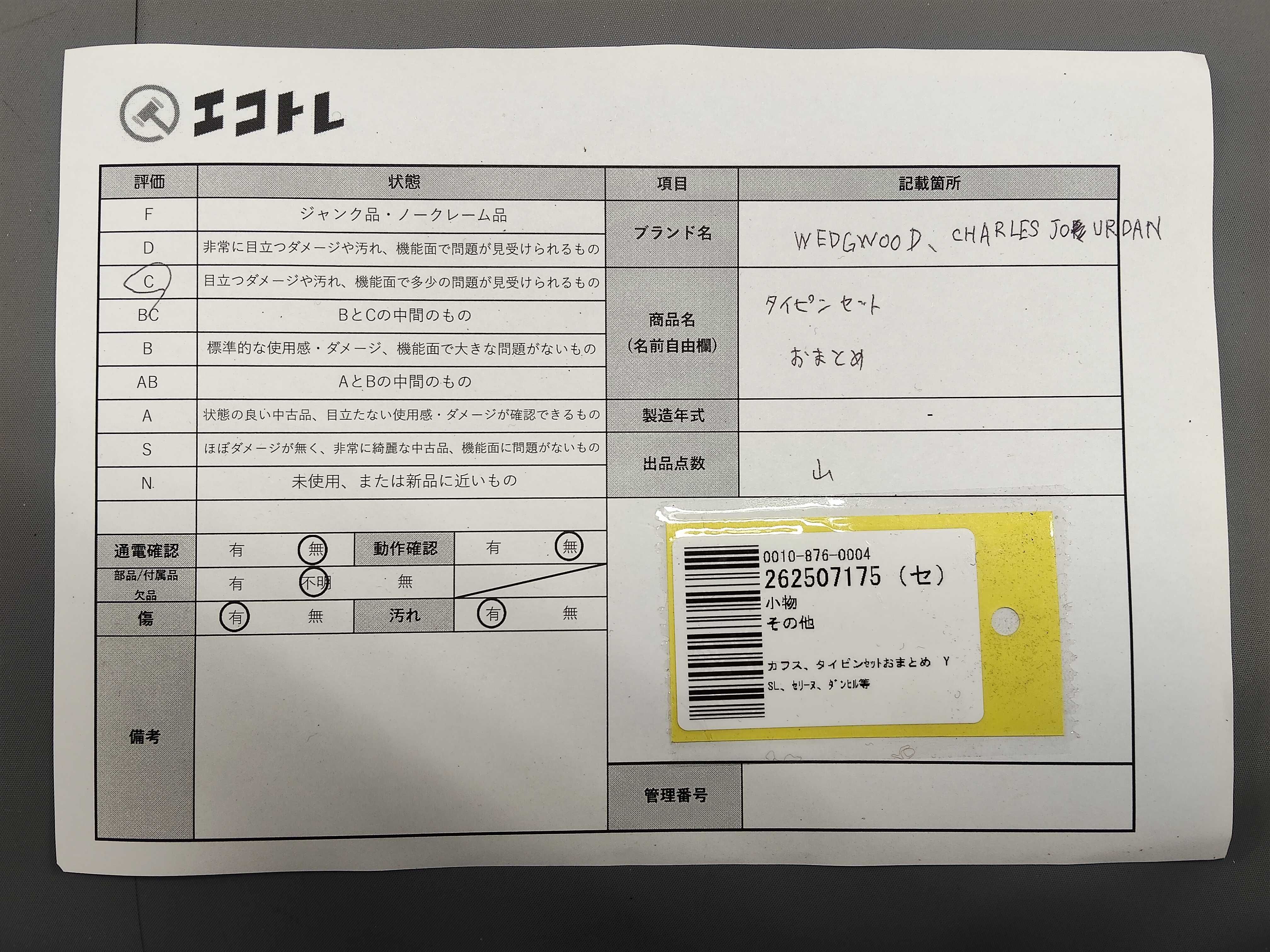 商品内容によって、JITBOXなどでの発送となる可能性がございます事ご理解下さい。年式などの商品情報詳細は写真にてご確認願います。※ご入札の際はご利用規約をよくお読みになってからのご参加お願いします。","タイプライン": "", "カテゴリ": "小物", "形状コード": "ネクタイピン・カフス", "付属品コード": "", "シリアル・シール・型番": ""