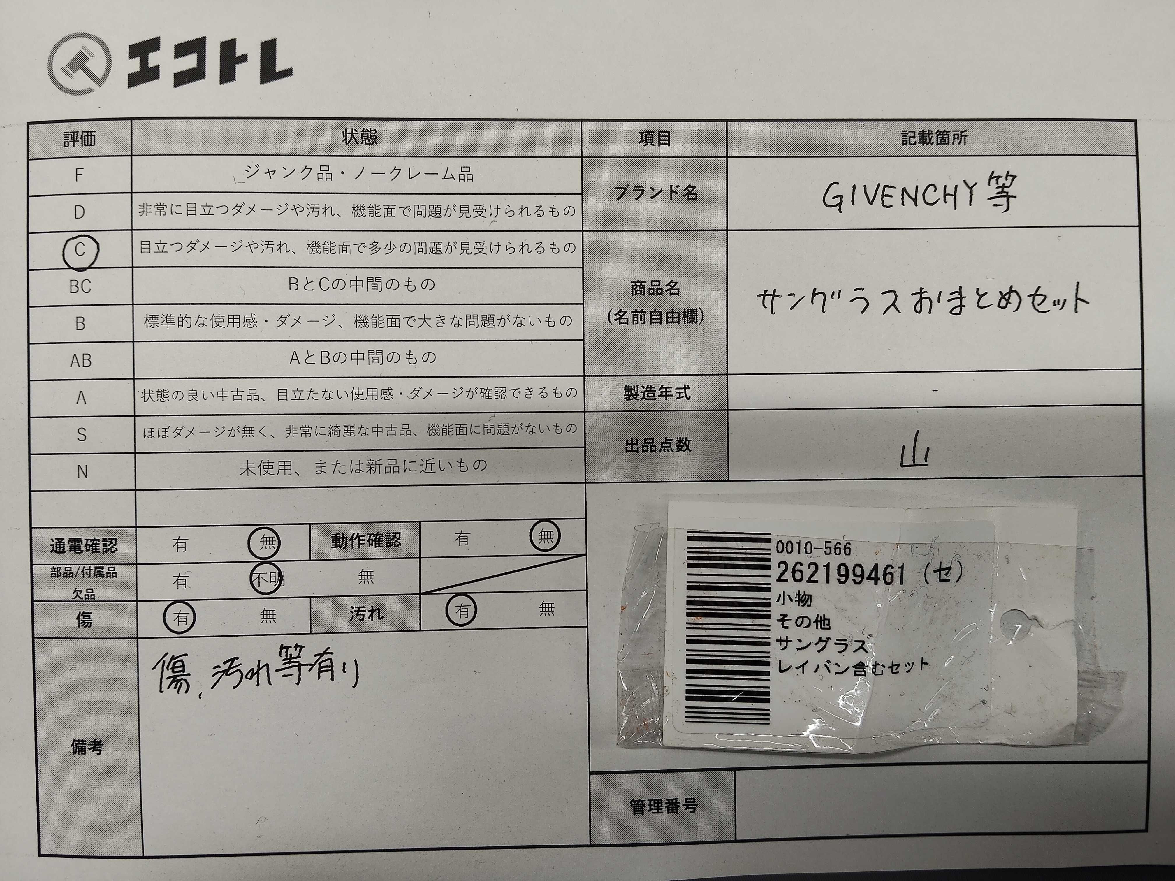 ◆CAN’T SHIPPING TO USA◆商品内容によって、JITBOXなどでの発送となる可能性がございます事ご理解下さい。年式などの商品情報詳細は写真にてご確認願います。※ご入札の際はご利用規約をよくお読みになってからのご参加お願いします。","タイプライン": "", "カテゴリ": "小物", "形状コード": "サングラス・メガネ", "付属品コード": "", "シリアル・シール・型番": ""