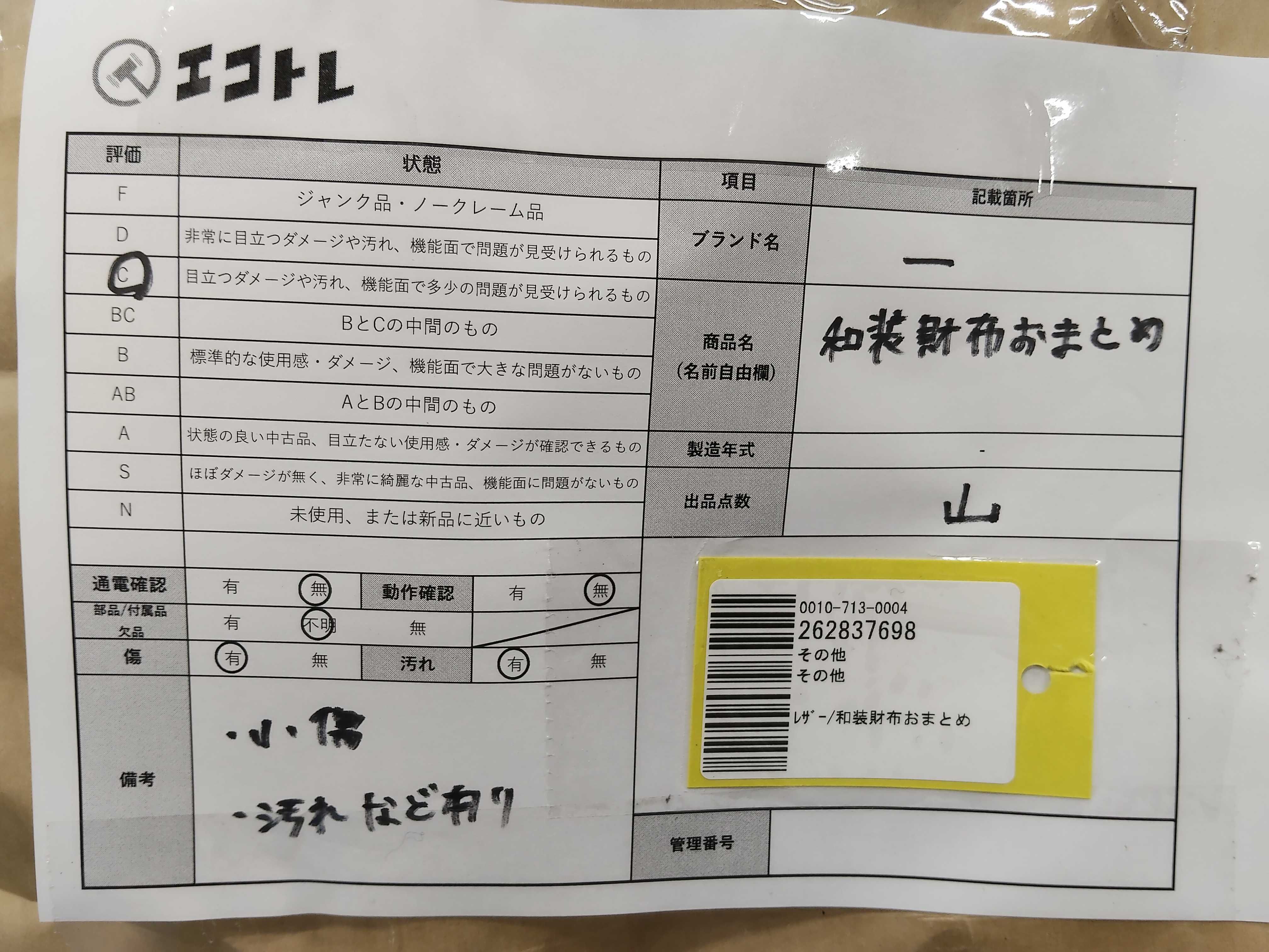商品内容によって、JITBOXなどでの発送となる可能性がございます事ご理解下さい。年式などの商品情報詳細は写真にてご確認願います。※ご入札の際はご利用規約をよくお読みになってからのご参加お願いします。","タイプライン": "", "カテゴリ": "小物", "形状コード": "財布", "付属品コード": "", "シリアル・シール・型番": ""