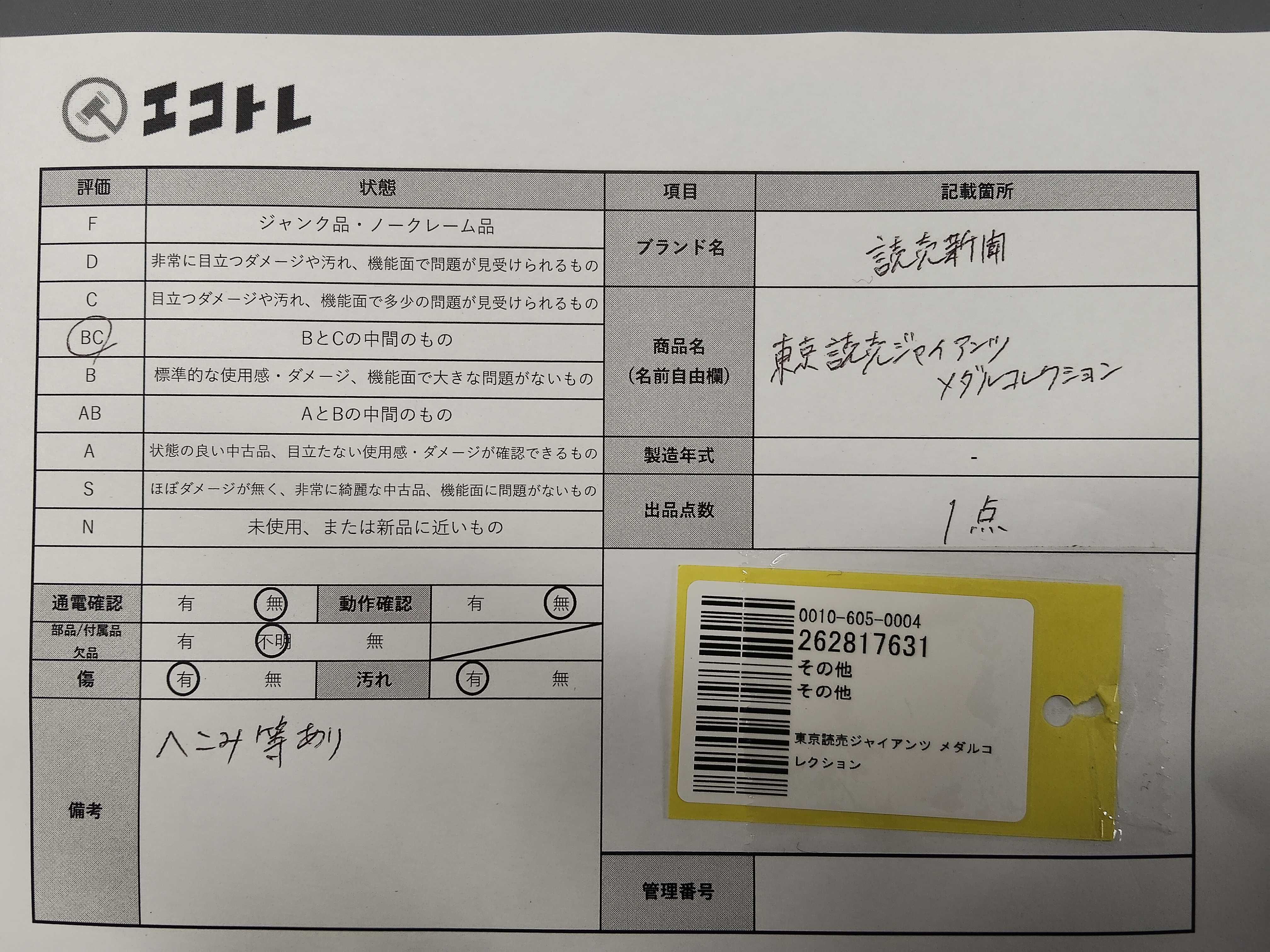 商品内容によって、JITBOXなどでの発送となる可能性がございます事ご理解下さい。年式などの商品情報詳細は写真にてご確認願います。※ご入札の際はご利用規約をよくお読みになってからのご参加お願いします。","タイプライン": "", "カテゴリ": "小物", "形状コード": "その他小物", "付属品コード": "", "シリアル・シール・型番": ""