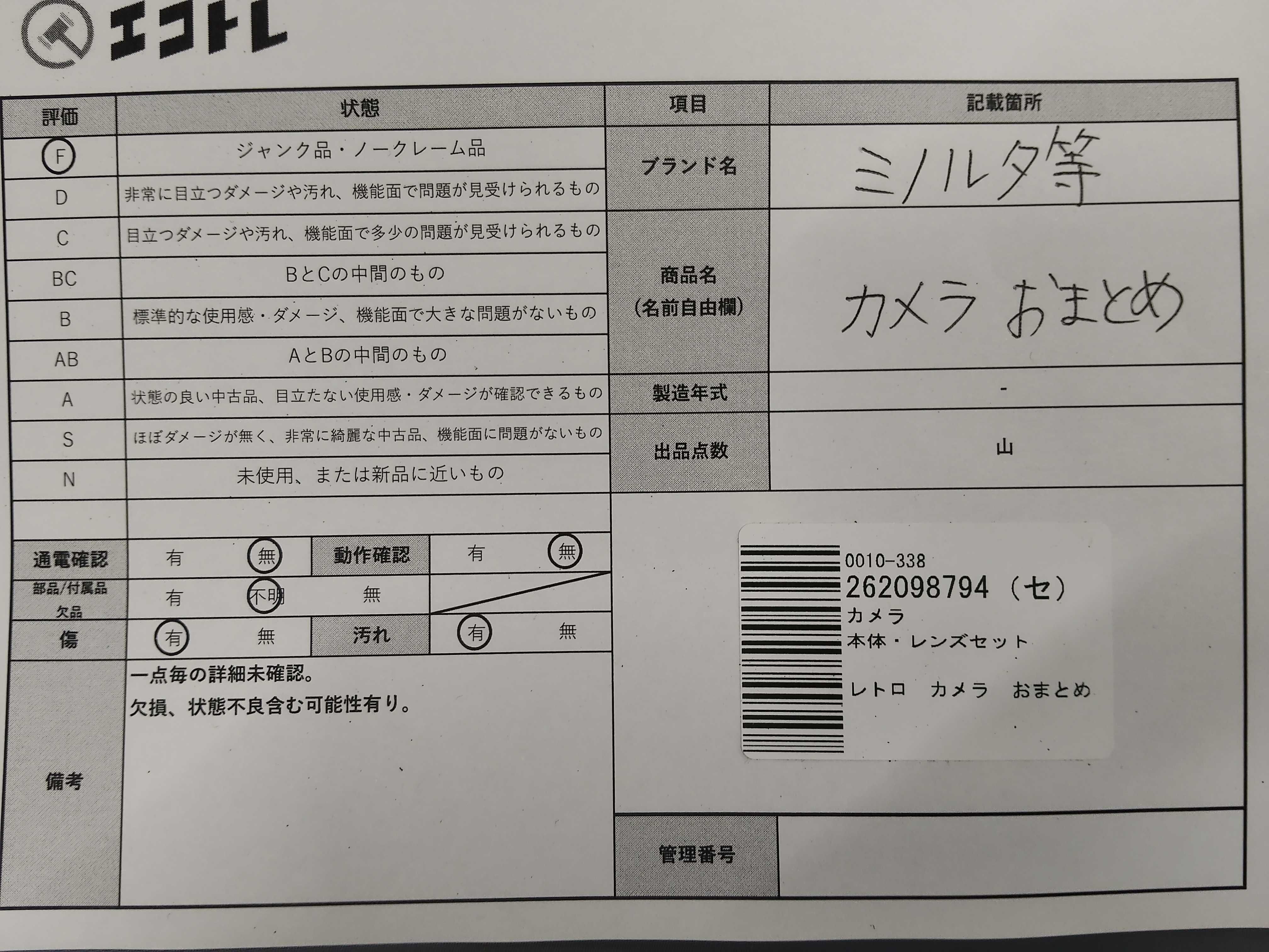 商品内容によって、JITBOXなどでの発送となる可能性がございます事ご理解下さい。年式などの商品情報詳細は写真にてご確認願います。※ご入札の際はご利用規約をよくお読みになってからのご参加お願いします。","タイプライン": "", "カテゴリ": "カメラ", "形状コード": "カメラ", "付属品コード": "", "シリアル・シール・型番": ""