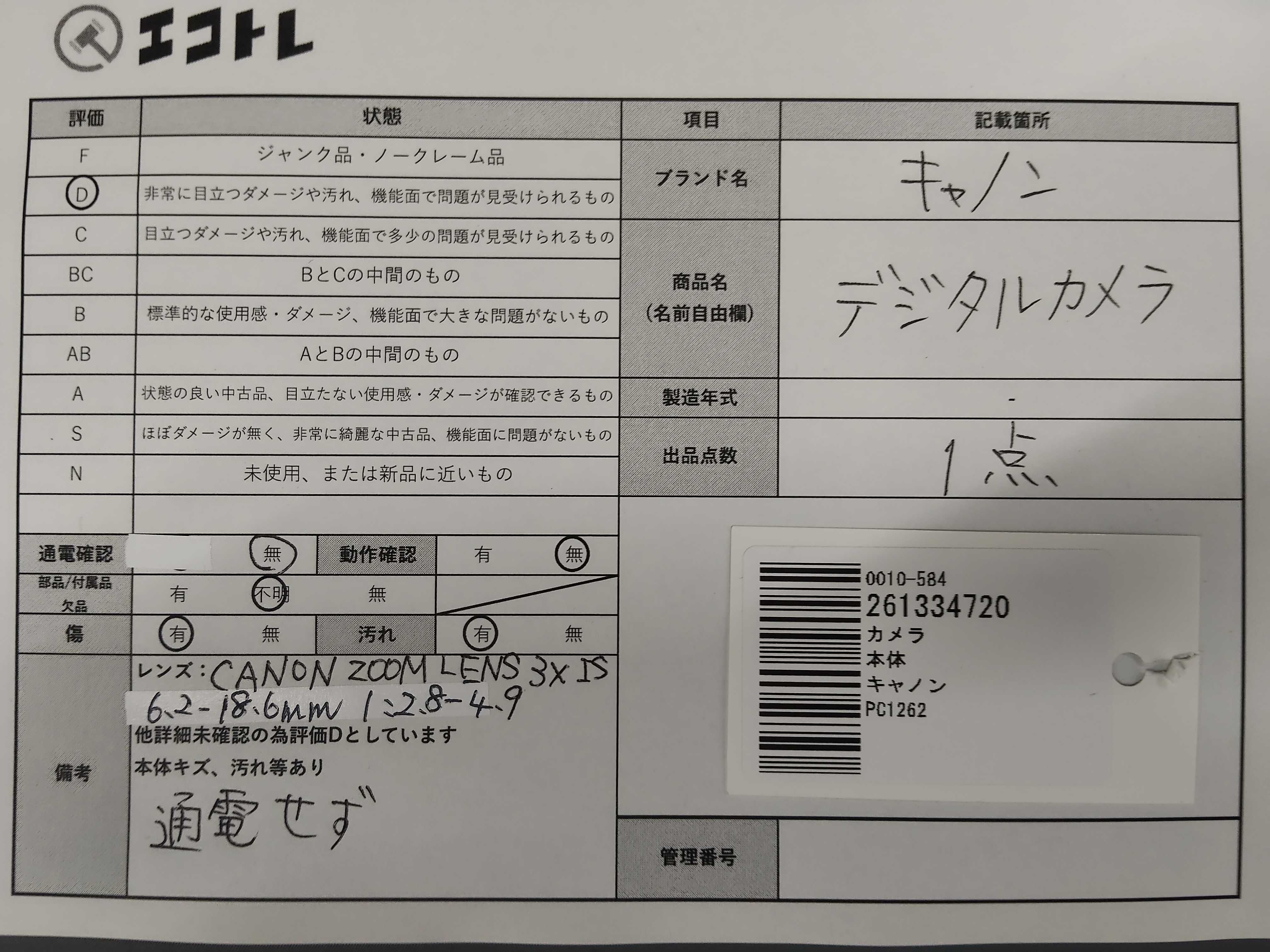 商品内容によって、JITBOXなどでの発送となる可能性がございます事ご理解下さい。年式などの商品情報詳細は写真にてご確認願います。※ご入札の際はご利用規約をよくお読みになってからのご参加お願いします。","タイプライン": "", "カテゴリ": "カメラ", "形状コード": "カメラ", "付属品コード": "", "シリアル・シール・型番": ""