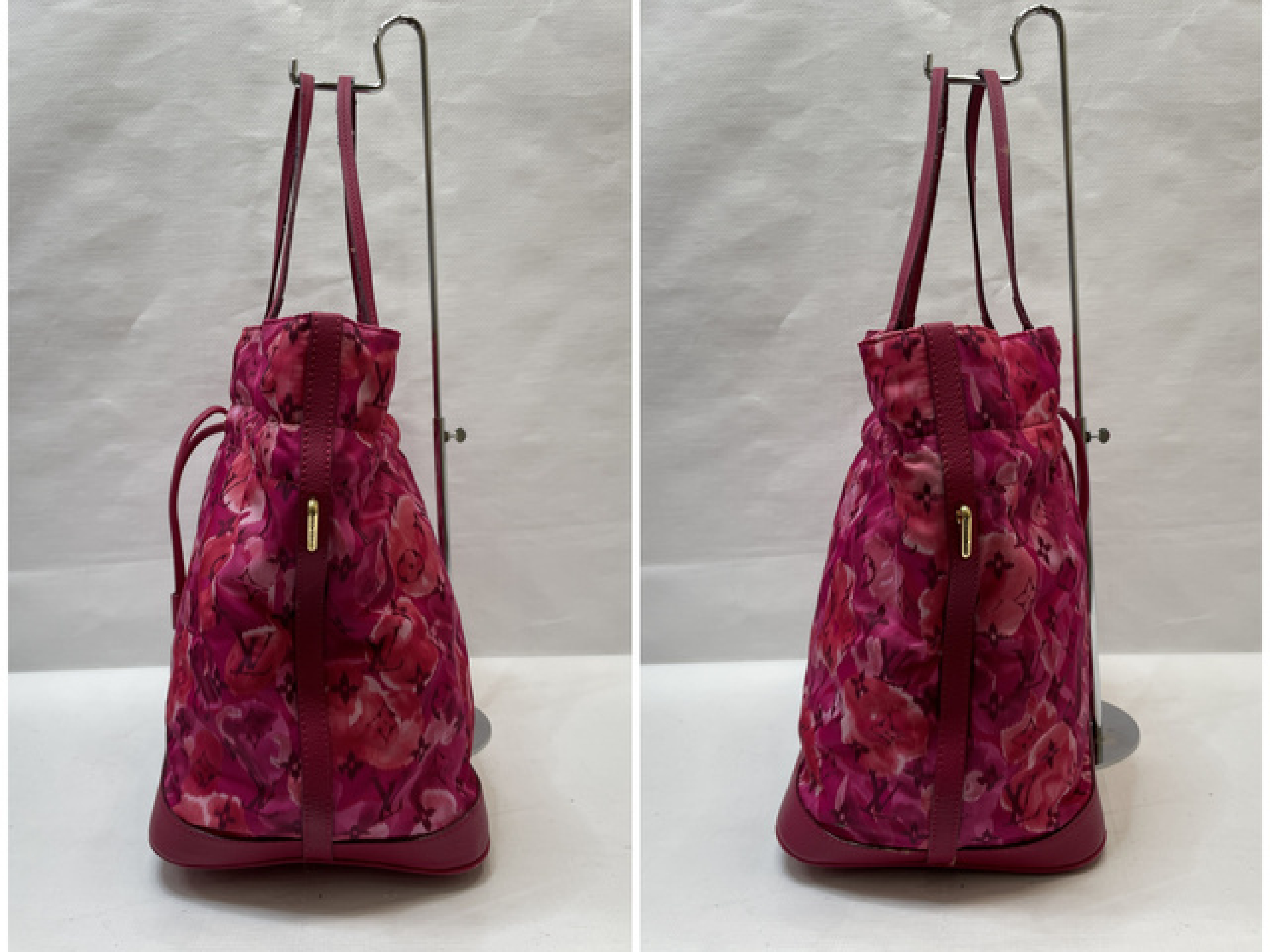 全体焼け擦れ汚れ(中) 角擦れ(中) 型崩れ(中) 持ち手しわヨレ黒ずみ(中) コバ溶け繊維付着(中) 金具擦れ傷くすみ(中) ショルダーコバ溶け(大) 内側べたつき汚れ(大)【付属品