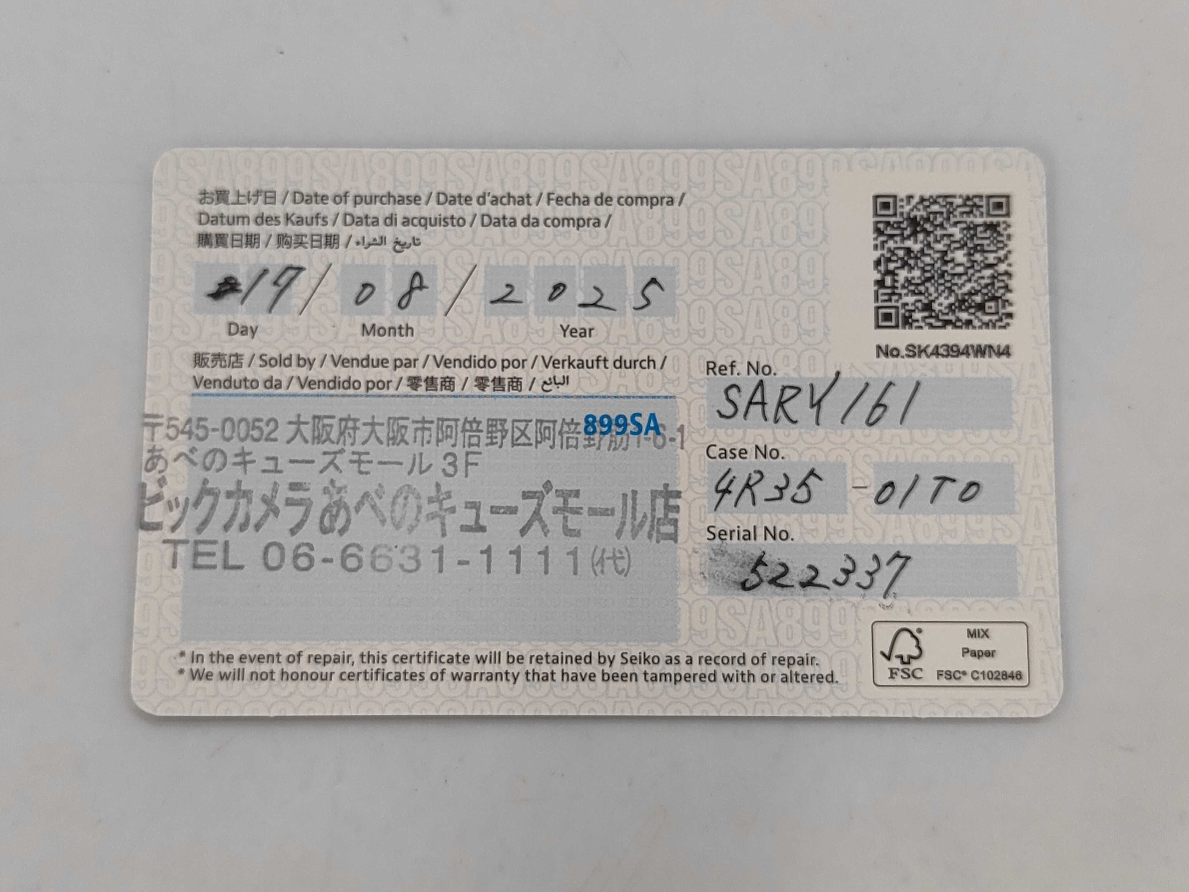 全体傷小 風防欠け傷小 ケース打痕傷小 リューズ打痕傷小 裏蓋ガラス傷小 コマ5 ギャラあり2025/08/17(書き直しあり)【付属品