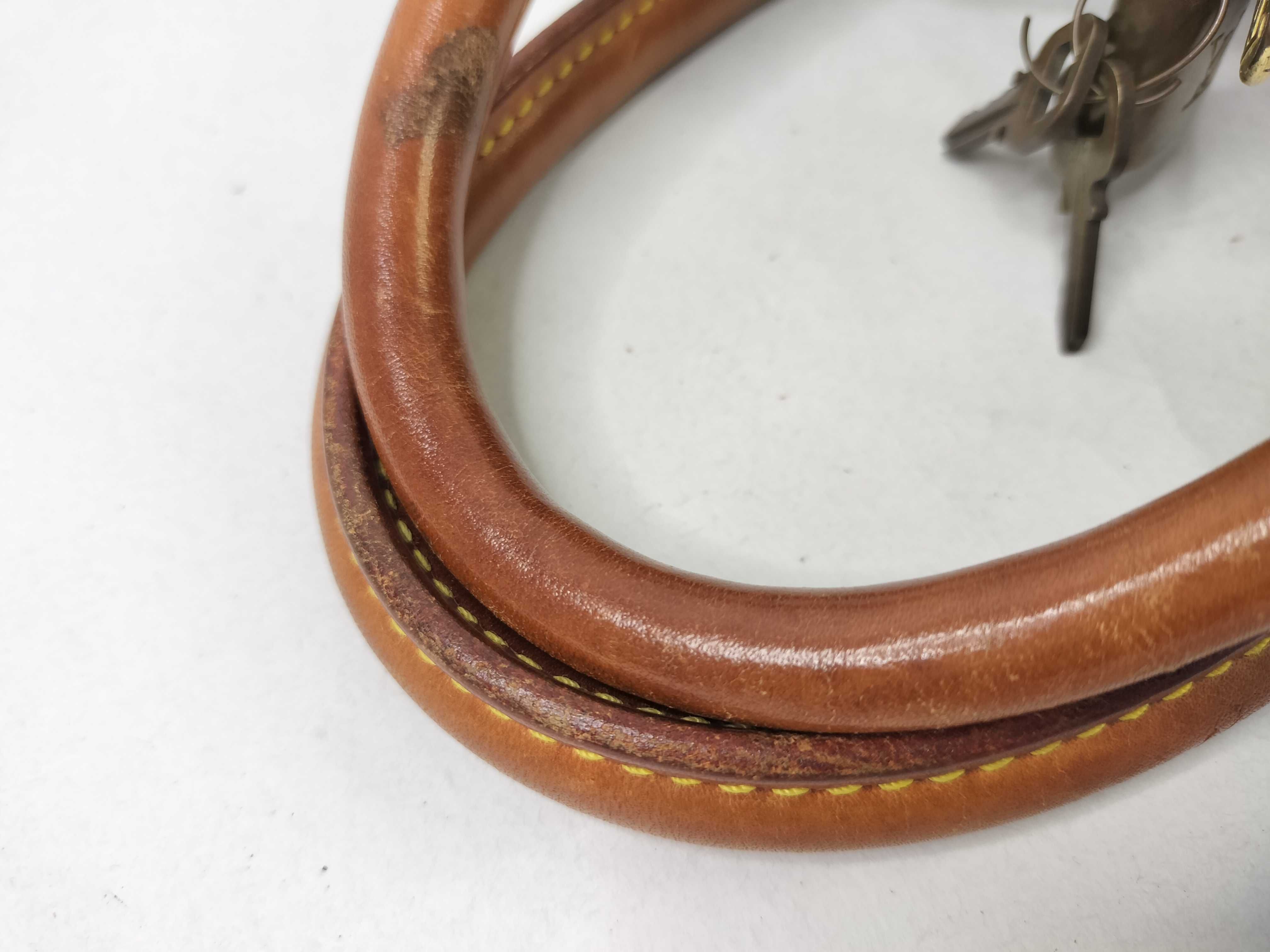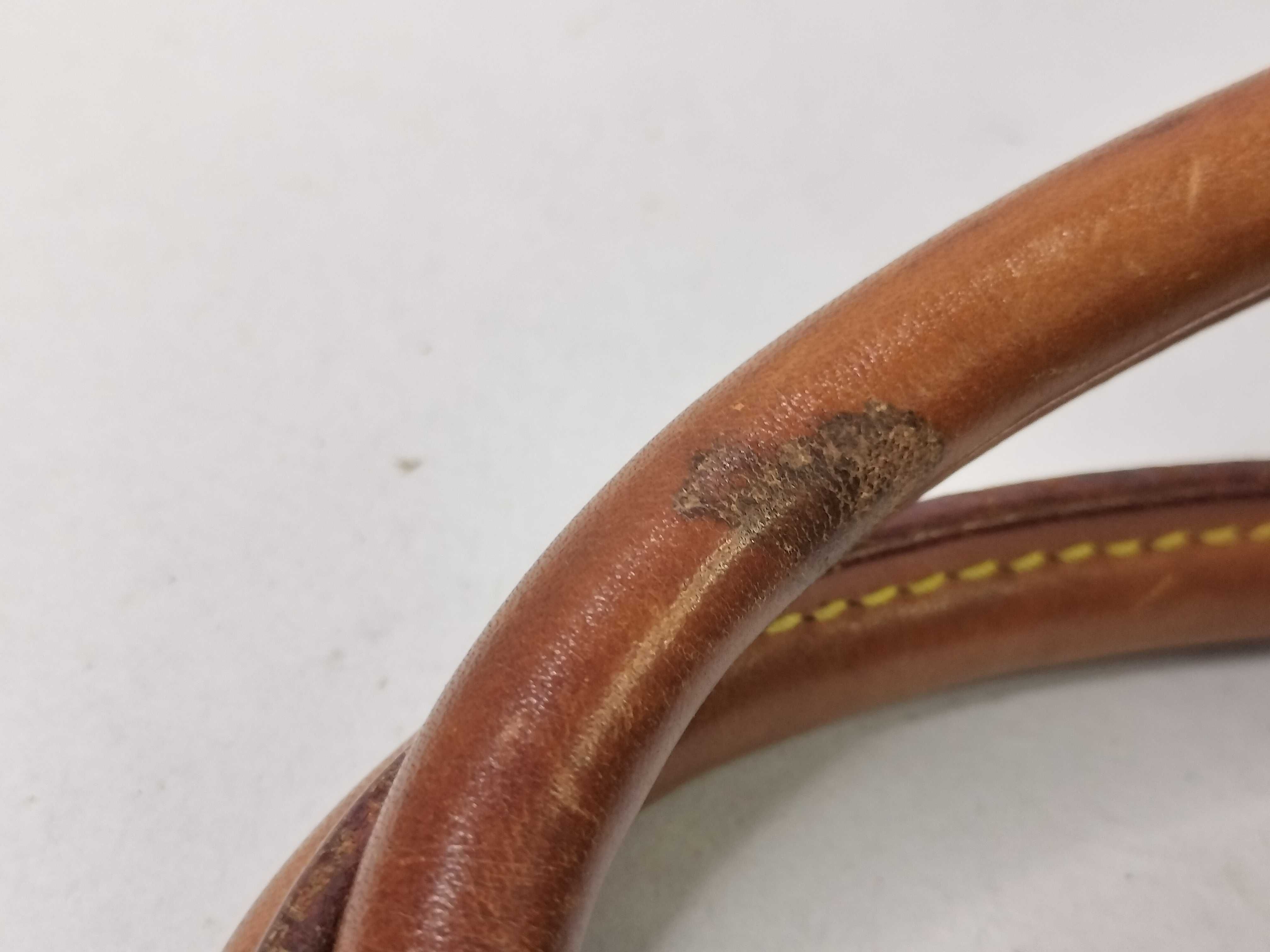 全体焼け擦れ汚れ(中) ヌメ革焼け黒ずみ染み傷(大) 持ち手黒ずみヒビ(中) 付け根伸び切れ(大) コバ擦れ(中) 角擦れ(中) 金具くすみ傷剥げ(中) 内側焼け擦れ汚れ(中) カビ臭有【付属品
